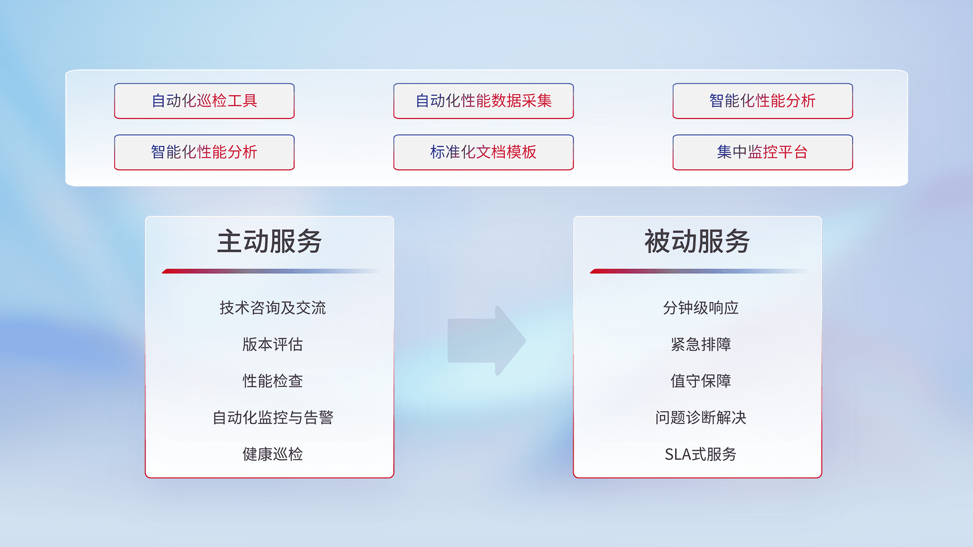 智能化工具和标准化文档,,,保障服务质量,,,,提供主动服务(包含技术咨询、、版本评估、、性能检查、、、自动化监控与告警、、健康巡检)和被动服务包含(分钟级响应、、紧急排障、、、、值守保障、、问题诊断解决、、、SLA服务)。。